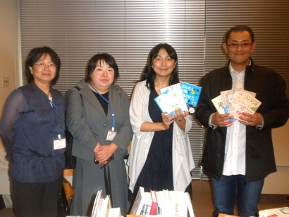 写真右から、増刷請負人 仁藤雄三。鎌倉幸子さん(公益社団法人シャンティ国際ボランティア会(SVA) 広報課長兼岩手事務所図書館事業スーパーバイザー)、千葉りかさん(同、経理・総務担当)。吉田晃子さん(同、SVA岩手事務所図書館事業担当)。