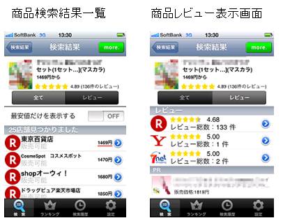 今回追加した「商品レビュー横断検索機能」とは、ユーザーからの要望が最も高く、商品バーコードをスキャンした際の価格比較に加え、大手ECサイトのユーザーレビューが一括表示される機能です。商品バーコードをスキャンすると、価格比較の下部にその商品に対するレビューが平均評価、レビュー件数とともに一覧表示され、商品レビュー表示のみにワンタッチで切り替えも可能です。ユーザーは商品をスキャンしたタイミングで、価格比較に加え、即座に複数のECサイトでの総合評価と他購入者の評価も参考に、より便利で快適に商品の購入が出来るようになりました。