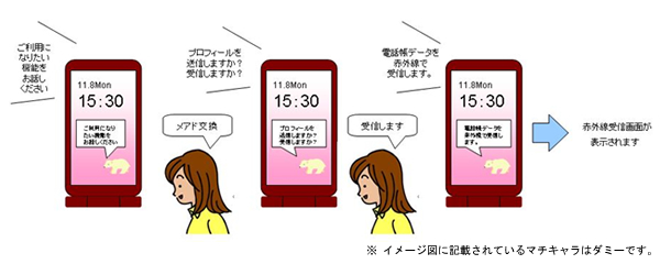 ユーザーが、画面上のマチキャラの問いかけに対して、希望する機能を携帯電話に話しかけると携帯電話がユーザーの声を認識して内容を把握し、次に必要な質問や説明を音声で行います。