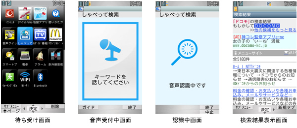 「しゃべって検索」は、検索したいキーワードを音声で入力することでiモード検索ができるという機能です。従来は「音声クイック検索」として搭載されていましたが、このたび認識エンジンを大語彙化することで、より広範囲な単語や文章を高い精度で認識できるようになり、新たに「しゃべって検索」として搭載されます。なお、従来の「音声クイック検索」においても認識エンジンの大語彙化対応を行い、「しゃべって検索」と同様の高い認識精度を実現いたします。