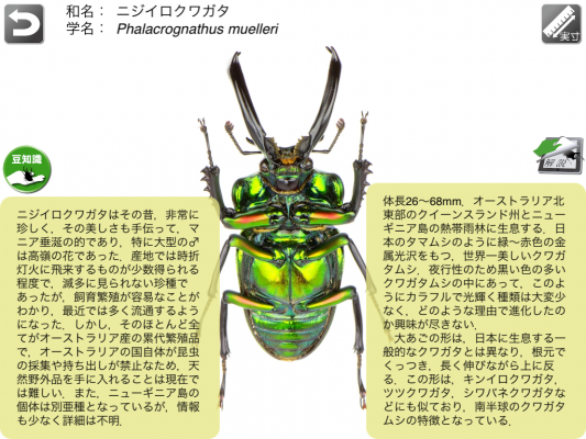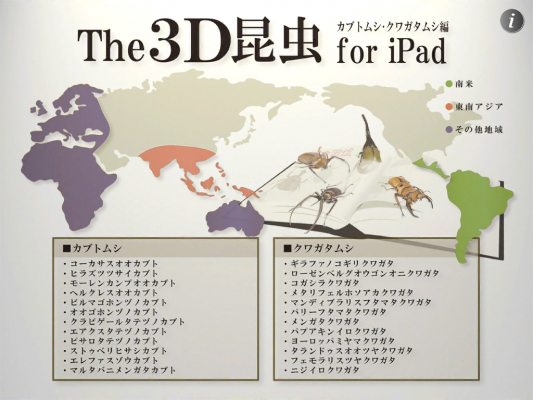 さらにiPad版では世界地図からその地域に生息するカブトムシ・クワガタムシを観察できるようになったほか、解説もより詳細になり豆知識も追加されました。また操作性も格段に向上し、よりご満足いただけるアプリとなりました。