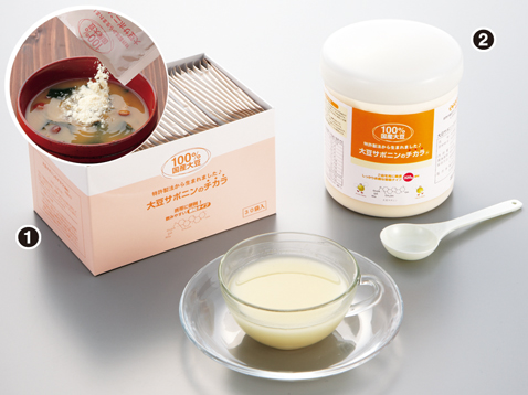 サポニンにはこの動脈硬化と身体の酸化(=老化)を予防するといわれています。このようにサポニンは非常に体にいいものの、大豆の苦みの素ともなっており、今まで「おいしく摂取する」ことが難しいのが現状でした。また、大豆サポニンは絞りかす(おから)部分に多く含まれており、搾り汁からできている豆乳や豆腐からでは摂取が難しい栄養素でした。しかし、本商品では、特許製法でサポニンの栄養成分はそのまま、粉末化に成功しました。