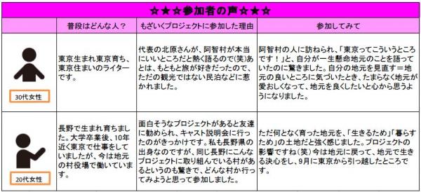 作品作りは各地区の住民との出会いや体験、共同作業を通して生まれた感動を素材にしており、作品作りの過程では、首都圏と阿智村という対照的な地域の人同士だけでなく、6地区の合併が完了して3年目になる阿智村の地域住民同士でも、互いの魅力を知り、また自身の魅力に気付くきっかけになっているようです。