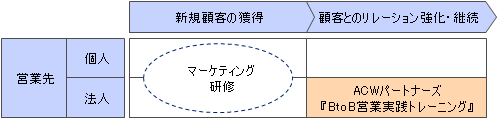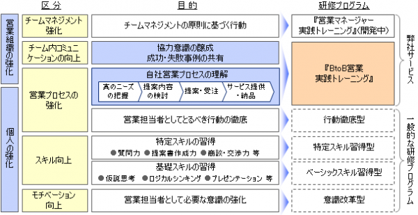 このような状況を踏まえ、『BtoB営業 実践トレーニング』では、経営の視点で顧客の真のニーズをつかみ、具体的な営業活動へと繋げていくためにヒントとなる枠組みや考え方を習得するとともに、参加者同士が同じ枠組みで成功・失敗事例を共有しあうことで、チームとしての力を引き上げることを目的としています。