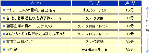 トレーナーが一方的に進めるのではなく、グループ討議の時間が約7割を占めています。自社の営業活動を題材としたグループ討議によって、参加者間の情報共有が進み、多くの気づきが得られます。仮説構築、効果的な提案、きめ細やかな段取りなどの必要な要素を、 “全てを一人でできなくても、相互に補完して、チーム全体でできればよい”と認識することも重要です。