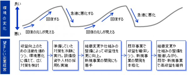 環境が急速に悪化してから慌てても打ち手は限られます。大切なことは、次に環境が悪化する時期を見据えて準備を進めることです。環境がやや回復した時に活動を始め、環境の悪化も想定に織り込みながら事業・組織を再構築していきます。