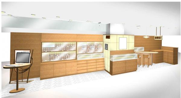 『アイデクト津田沼パルコ店』の店舗全体は、ナチュラルな木目調のデザインで、落ち着いた雰囲気を演出しています。ディスプレイは、壁面の埋め込み型の什器を新たに採用し、リングやペンダントトップ、ピアスなどのジュエリーリフォームのサンプルを、お客様が自由に手に取って見ることができるように展示しています。