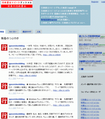行政書士ツイートドットコムは、1ツイート200文字内、新着や人気、タグやカテゴリー、お気に入りやフォロー、プライベートメッセージなど行政書士専門のツイッター風サイトです。
