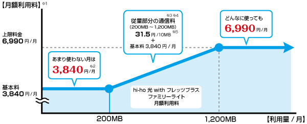「hi-ho 光 with フレッツプラスライトコース」は従来提供している「hi-ho 光 with フレッツプラスコース」と比較して月額料金が安価なうえ、NTT東日本の月額料金もインターネットのご利用状況に応じて決まるため、インターネットのご利用機会が少ないお客様にも光ファイバー接続サービスをご利用いただきやすくなります。