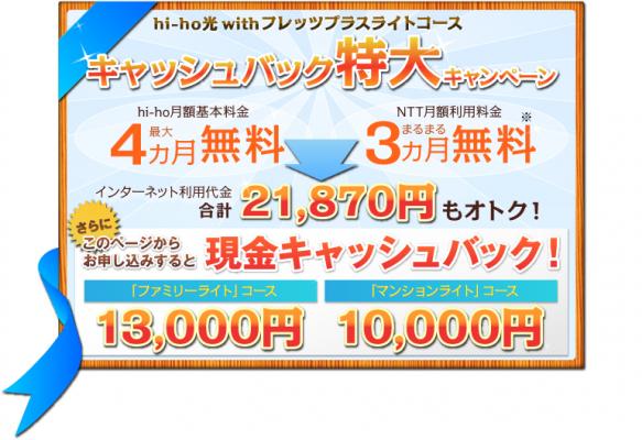 hi-hoでは本サービスの提供にあわせて、「キャッシュバック特大キャンペーン」を実施いたします。本キャンペーンでは、NTT東日本の「フレッツ 光ライト」回線取次ぎサービスと同時に「hi-ho 光 with フレッツプラスライトコース」をお申し込みいただいたお客様対象に、hi-ho月額料金を最大4カ月間無料にいたします。さらにキャンペーン特典として、郵便為替にて13,000円をキャッシュバック(※1)いたします。