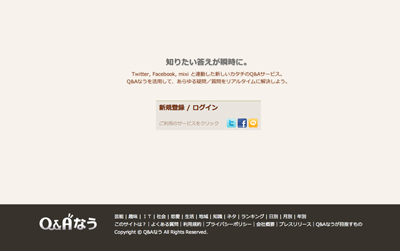 国内初のリアルタイムQ&Aサービス。TwitterやFacebookとソーシャル連携することで、即時性の高いQ&Aサービスを実現しています。Q&AなうAPIにより、BIGLOBE運営のTwitterクライアント「ついっぷる」、大手スポーツサイト「日刊スポーツ」、Twitterクライアント最大手の「モバツイ」と提携するなど、集合知をリアルタイムで活用する未来型サービスとして注目を集めています。登録会員数8.6万人、質問と回答の総投稿数500万件。2009年11月14日のサービス開始以来、約12秒に1件のペースで投稿が行われています。