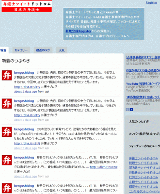 弁護士ツイートドットコムは、1ツイート200文字内、新着や人気、タグやカテゴリー、お気に入りやフォロー、プライベートメッセージなど弁護士専門のツイッター風サイトです。