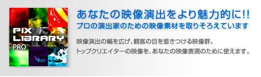 『PIX LIBRARY pro』の映像素材はアーティストの個性が強く出ているものばかり。その分、他では手に入らない個性豊かなオリジナルの映像素材集となっています。