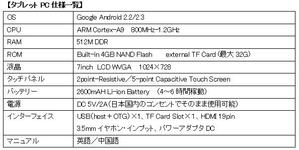レノボ、華為、ハイアールなど中国大手メーカーのOEMを行っている工場で製造された高性能Andoroid2.3/2.2タブレットPC端末を格安でご提供いたします。操作画面は日本語に対応、日本のコンセントからそのまま充電ができ、またアンドロイド・マーケットからのアプリ購入も可能です。さらに、WIFI、3G、HDMI、1080p、3D GAMEにも対応。最低注文数は5台から、1台あたり12,800円(税抜き)でご購入いただけます。