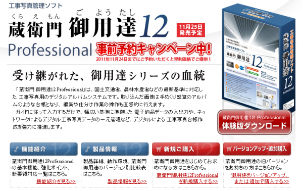 株式会社サンロフト(静岡県焼津市、代表取締役社長:松田敏孝)は、工事写真管理の定番ソフト「蔵衛門御用達 12 Professional」の2011年11月25日発売に向け、2011年11月10日より事前予約特価キャンペーンを開始しました。