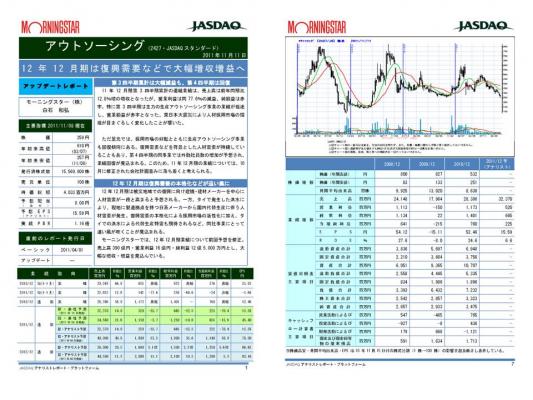11年12月期第3四半期累計の連結業績は,売上高は前年同期比12.8%増の増収となったが,営業利益は同77.6%の減益,純損益は赤字。特に第3四半期は主力の生産アウトソーシング事業の業績が低迷し,営業損益が赤字となった。東日本大震災により・・・