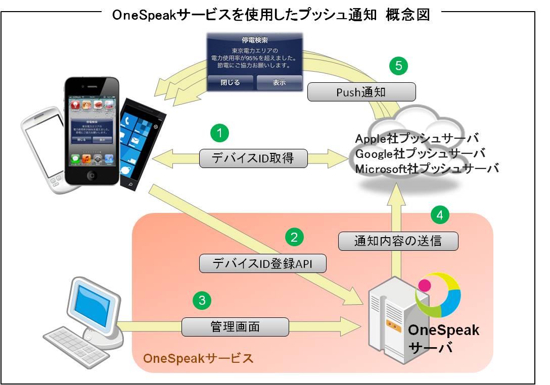 OneSpeakはスマートフォンアプリでのプッシュ通知機能部分をSaasとして提供する事により、スマートフォンアプリを開発する会社、スマートフォンアプリを提供する事業者に容易にかつ短期でプッシュ通知機能を自社アプリに組み込む環境を提供します。