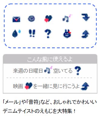 コンテンツ内容:「メール」や「音符」など、おしゃれでかわいいデニムテイストのえもじを大特集!