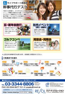 ホテルやゴルフ場等の運営から企業や団体の福利厚生代行サービスまでを手掛けるリゾートソリューション株式会社(略称:リソル、東京都新宿区、平田秀明社長)では、同社の福利厚生代行サービス「ライフサポート倶楽部」会員をはじめとする、リソル各種会員向けに様々なサービスを随時企画し、会員の皆様から好評をいただいておりますが、このほど各種イベントや会合等における幹事さんの強力な助っ人「幹事代行デスク」を新スタートさせました。