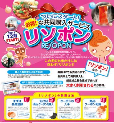 新スタートする『リソポン』は、数年前より急速にマーケットが拡大してきた共同購入方式のクーポンサイトであり、生活用品、食品等といった商品はもちろん、各種イベントのチケット、ホテルや旅館等の宿泊サービス、ゴルフ場、人間ドック等、多彩な商品やサービスを取り扱う予定となっています。