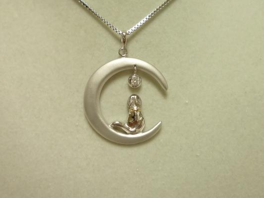 三日月に乗った犬が天然貴石0、1ctダイヤ、ルビー、イエローサファイヤ、