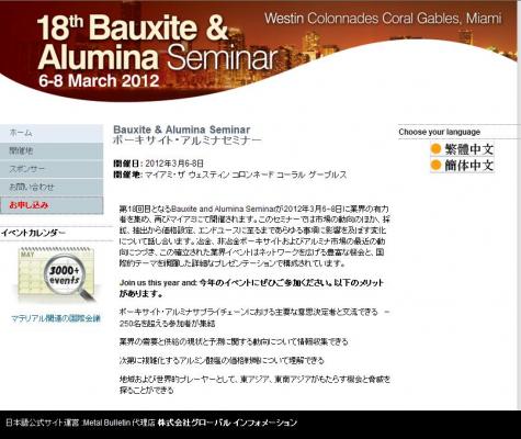 株式会社グローバル インフォメーションでは、皆様の利便性を図る為に、日本語、韓国語、中国語で「18th Bauxite & Alumina Seminar 2012」の情報を提供するとともに、会議の参加のお申し込みを承っております。