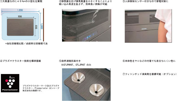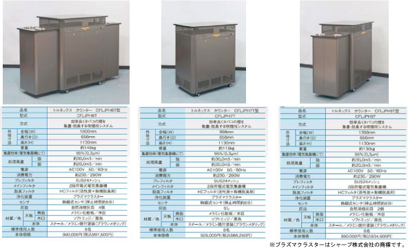 そこで、今回発売致します「トルネックス カウンター CFLJPH9T」は、コンパクトでありながら、大風量の吸引能力を実現しています。また、排気面積を広くして排気風速を遅くすることにより、吸い込み気流を乱さず、効率良く煙を捕集できるように設計しています。さらに、大型の自然消煙灰皿を2個標準装備しておりますので、公共的な場所の喫煙所に最適です。人体検知センサー付きで省エネ運転を実現、シャープ株式会社のプラズマクラスター技術を搭載しています。