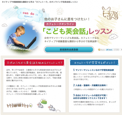 子供英会話の需要はますます高まり、低年齢化も進んでいます。カフェトークでは、無料会員登録、お子様のスカイプ利用サポートや無料カウンセリング、体験レッスンの充実など、安心して始められるサービスを提供しています。