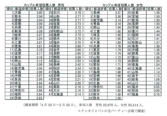 また同社のパーティーでは、最終的にカップルになってもよいと思う異性を、第6希望まで投票することができる。一人当たりの投票者数が最も多かったのは、男性は大阪で3.85人、次いで熊本の3.56人、愛媛の3.54人と続く。女性は第1位が長崎で2.31人、次いで大阪の2.30人、鹿児島の2.14人と続く。