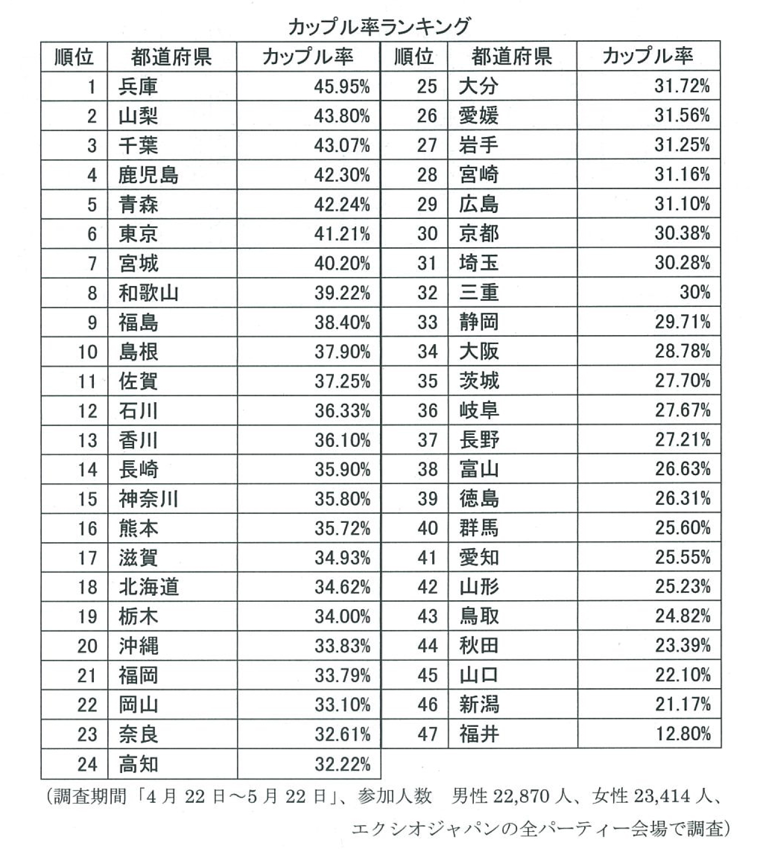 全国で婚活パーティーを展開するエクシオジャパンが行った、パーティー参加者を対象とするアンケート結果(調査期間「4月22日~5月22日」、参加人数 男性22,870人、女性23,414人、エクシオジャパンの全パーティー会場で調査)によると、カップル成立率の第1位は兵庫で45.95% 。第2位は山梨の43.80%。第3位は千葉の43.07%と続く。