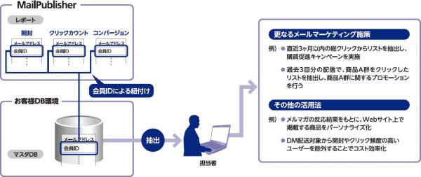 MailPublisher Smartにおいて、効果測定結果として取得可能なメールの開封者リストや特定URLのクリックリストへ、任意の項目を付加できるようになります。例えばECサイトで扱う会員IDを指定した場合、これまでメールアドレス+効果測定結果で出力していたレポートが、会員ID+メールアドレス+効果測定結果という形式で出力されます。これにより、メールで得られた効果測定結果の基幹システムへの反映が、柔軟に行えるようになり、企業がもつ基幹データベースを中心としたCRMの実現を容易にします。
