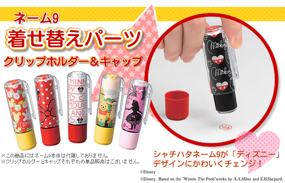 お手持ちのネーム9をディズニーキャラクターデザインのネーム印に着せ替えが出来る、クリップホルダーとキャップのセットです。
