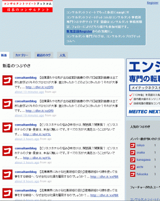 コンサルタントツイートドットコムは、1ツイート200文字内、新着や人気、タグやカテゴリー、お気に入りやフォロー、プライベートメッセージなどコンサルタント専門のツイッター風サイトです。