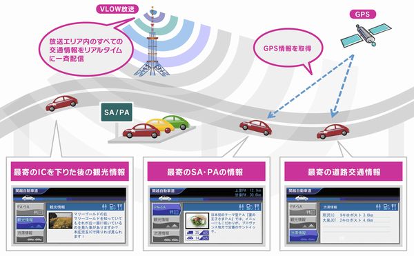 この実験は、次世代型の道路情報サービスを実現する要素技術であり、片方向ネットワークである放送メディアにおいても、通信ネットワークを使用せず、走行位置に応じたきめ細かいコンテンツを提供することが可能となります。