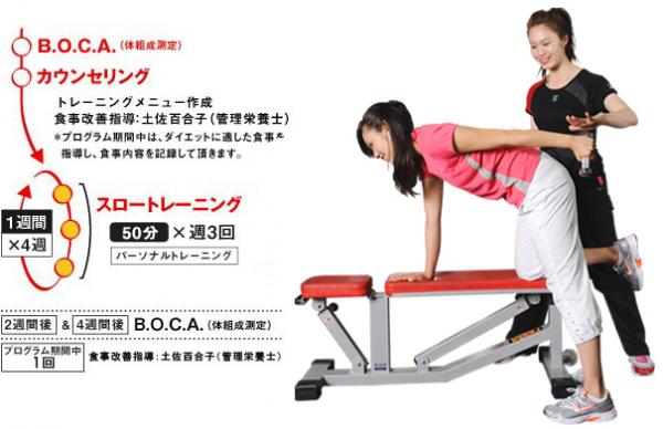 「30日間集中ダイエット」は、安全で最大限の効果を実感できる、今話題の「スロートレーニング」を1ヶ月(計12回)の期間、集中的に行っていただくプログラムです。筋肉にじっくりと集中して負担をかける「スロートレーニング」は、短時間で効果的な筋力アップを実現します。通常のトレーニングよりも基礎代謝が高まることで、太りにくい体をつくります。専属トレーナーが個人に合わせたトレーニングプランを作成し、マンツーマンで最後までサポートするため、一人では諦めがちであったトレーニングも、最後まで続けていただくことができます。