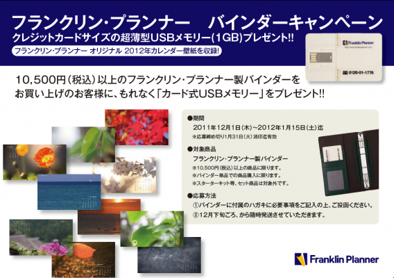 2011年12月1日(木)より、フランクリン・プランナー製バインダー10,500円(税込)以上お買い上げのお客様に、超薄型USBメモリをプレゼント致します。USBメモリには、写真家樋貝吉郎さんの素敵な自然風景の2012年度版カレンダー付フランクリン・オリジナル壁紙がインストールされています。