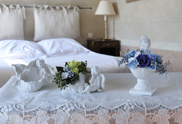 繊細なウェーブ模様の貝はお花を優しく包みこむよう。童話に登場するような神秘的だけど親しみやすい天使がフラワーアレンジを見守っています。