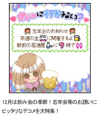 コンテンツ内容:12月は飲み会の季節!忘年会等のお誘いにピッタリなデコメを大特集!
