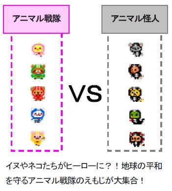 コンテンツ内容:イヌやネコたちがヒーローに?!地球の平和を守るアニマル戦隊のえもじが大集合!