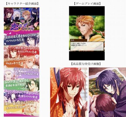 攻略キャラは霧隠才蔵、石川五右衛門、猿飛佐助、風魔小太郎らイケメン忍者達!さらに宮本武蔵、織田信長などの歴史上の有名人物も多数登場!