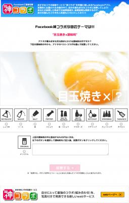 「神コラボ」 おすすめコラボ投稿サービス「神コラボ」をFacebook上で気軽にできるようにFacebookアプリとしてもご用意しました。定期的に出される「お題」に対して、あなたが考える最もベストなコラボを選んで投稿。みんなの投票結果をリアルタイムで閲覧する事もできます。Facebook神コラボの「お題」第一弾は 『目玉焼き×調味料』 です。