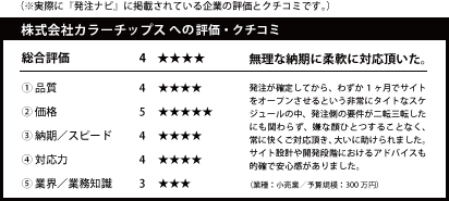 『発注ナビ』掲載のITサービス企業を、項目ごとに採点して総合評価を算出します。発注担当者は、企業のクチコミや評価を書き込んだり、閲覧したりすることができます。