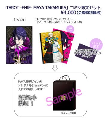 12月発売のイラストレーターMAYA氏による全描き下ろしのタロットカード「TAROT -ENIE- MAYA TAKAMURA」イベント限定セットを販売。タロットカードに加え、コミケ限定のクリアファイル(描き下ろし含む)、メッセージペーパー、MAYA氏オリジナルデザインのショッパーが付属。