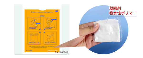 凝固剤(吸水性ポリマー)入りなので、すぐに固まり、ゴミとして捨てられます。