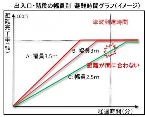 しかし、避難者が一斉に「津波避難ビル」に集中し、上層階に避難しようとした場合、出入口や通路、階段の幅員等によって処理能力が制限され、避難に時間がかかってしまい、せっかく設置されている「津波避難ビル」の効果を発揮できなくなる恐れや、想定される避難者数に対して、「津波避難ビル」に必要十分な容量(収容人数)が確保されておらず、上層階に入れない=避難が間に合わない人が発生してしまうリスクがあります。
