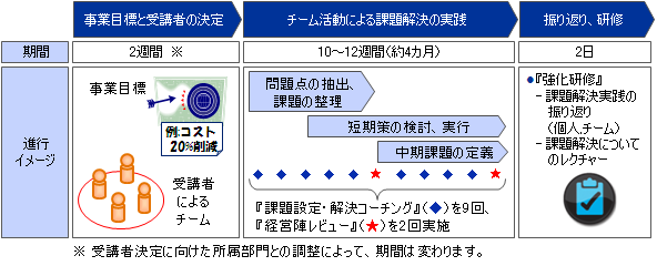 手法はあくまで手段であり、使って初めて自分のものになります。受講者は、体系的な課題解決手法を熟知したコーチからのコーチング(『課題設定・解決コーチング』)を受けながら課題解決を実践した後、『強化研修』によって方法論を深く理解することができます。実践前に研修を受ける場合に比べて、受講時の真剣さと集中力が全く異なります。
