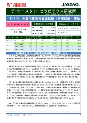 11月30日,同社が創製した緑内障治療剤「K-115」について,ライセンスアウト先の興和が国内第III相臨床試験(併用試験)の実施に向けて,「臨床試験情報」(財団法人日本医薬情報センターが運営する臨床試験情報公開のためのウェブサイト)を通じて情報を公表した。情報が公表されたのは・・・