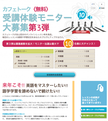 この度の第3弾では、モニター応募総数を拡大し、最大で10名様がモニター当選となります。モニター当選者は、カフェトークの有料レッスンの中からお好きなレッスンを選択し、3ヶ月間(週1回以上/合計12回分)、無料で受講できます。