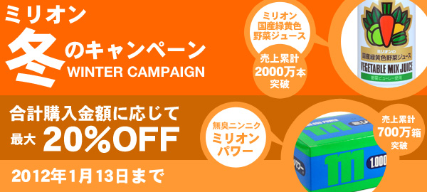 無臭ニンニク健康補助食品として25年のロングセラー商品「ミリオンパワー」、そして健康に配慮した「ミリオン健康飲料シリーズ」を販売するミリオン株式会社(埼玉県さいたま市)は、電話通販およびネット通販においての買物合計金額に応じた割引サービスを実施します。 (https://nsf.tc/~millionpower/campaign.html)対象となるのは、ミリオンパワー、ミリオン健康飲料シリーズなど、13点の自社商品。このうちどのような組み合わせでも合計金額が1万5千円以上で、最大20%の割引が受けられます。