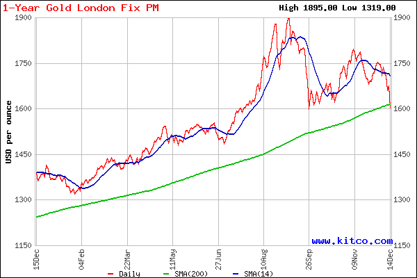 NY「金」相場12/7の終値は1743ドル、昨日12/14の終値は1576ドルで5営業日で167ドルの下げとなった。